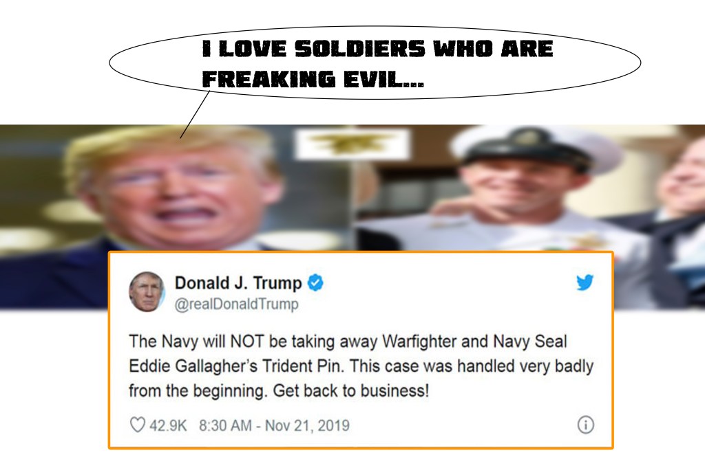 Eddie Gallagher was acquitted after a war crimes prosecution in the murder of a 17-year-old of Isis prisoner, but convicted of posing with his corpse. He was demoted by military authorities until the intervention of Mr Trump, who invited him to his Florida estate.