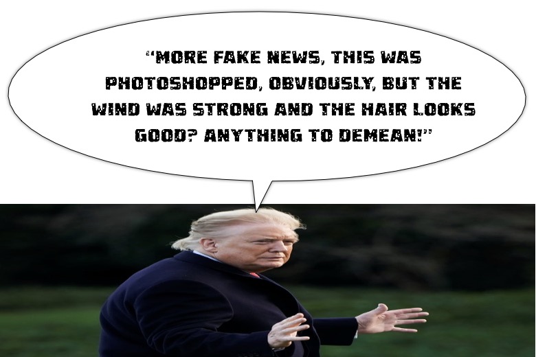 “More Fake News,” Trump wrote as he shared the black-and-white version of the photo. “This was photoshopped, obviously, but the wind was strong and the hair looks good? Anything to demean!”