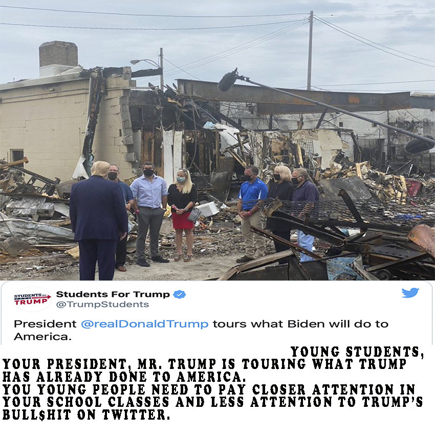 On Tuesday, the group Students for Trump posted a picture of the president standing amid rubble after rioting in Kenosha, Wisconsin — and claimed that the image represented “what Biden will do to America.”