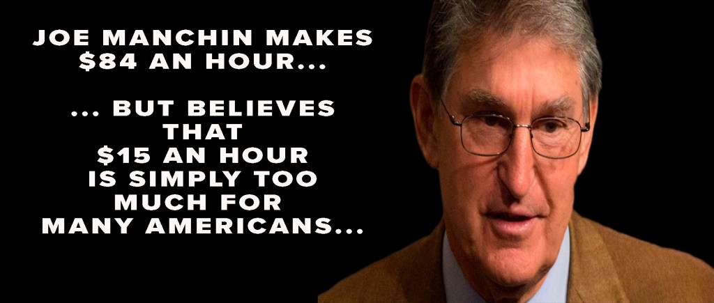 Manchin has decided that tens of million of Americans working for minimum wage don’t deserve $15 an hour. He wants to cap the maximum increase to $11 an hour. He thinks $15 an hour, or about $31,0000 a year, as a full-time minimum employee is just too much.