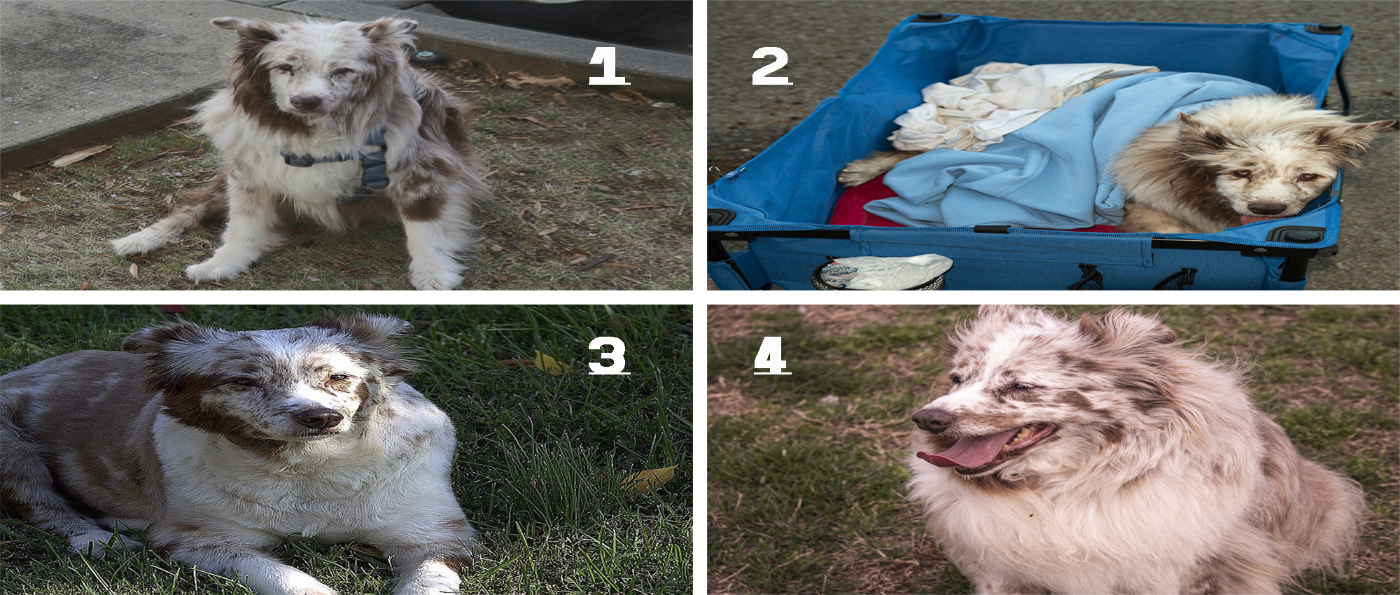 I continued to treat Lakoda with undetermined cost. She continued to decline. In January 2018, I bought a blue wagon so I could take her with me when I went on walks. She could walk, but not for long distances. The wagon allowed me to take her to a park about a mile away so she could enjoy being outside the house. Photo 2 shows Lakoda in the blue wagon and photo 1 shows Lakoda after we had arrived at a destination and I had removed her from the wagon. The two photos are form March 2018. Photo 3 is from 2011 and 4 is from 2014.