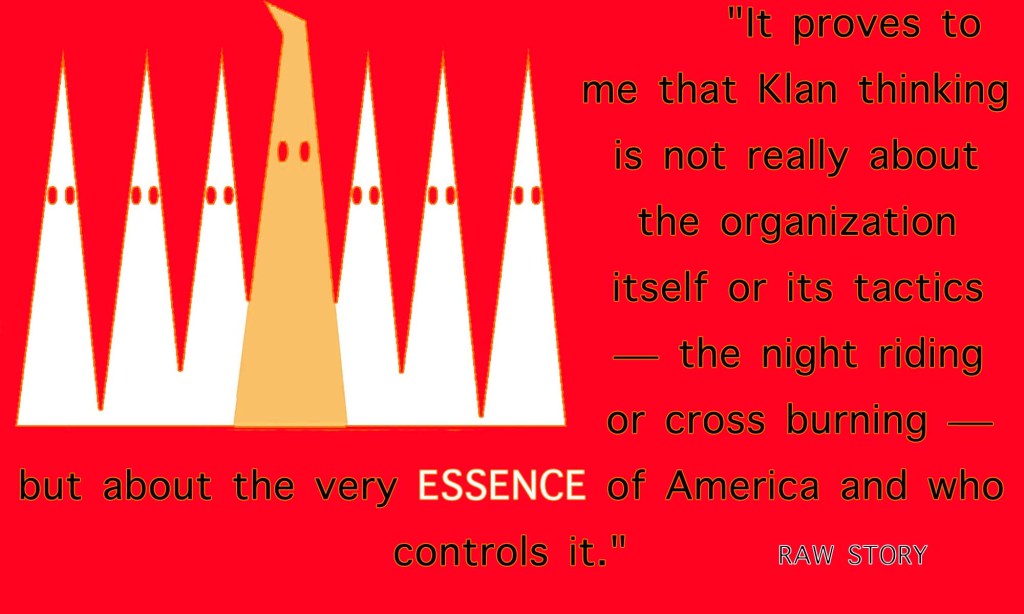 “It proves to me that Klan thinking is not really about the organization itself or its tactics — the night riding or cross burning — but about the very meaning of America and who controls it.”