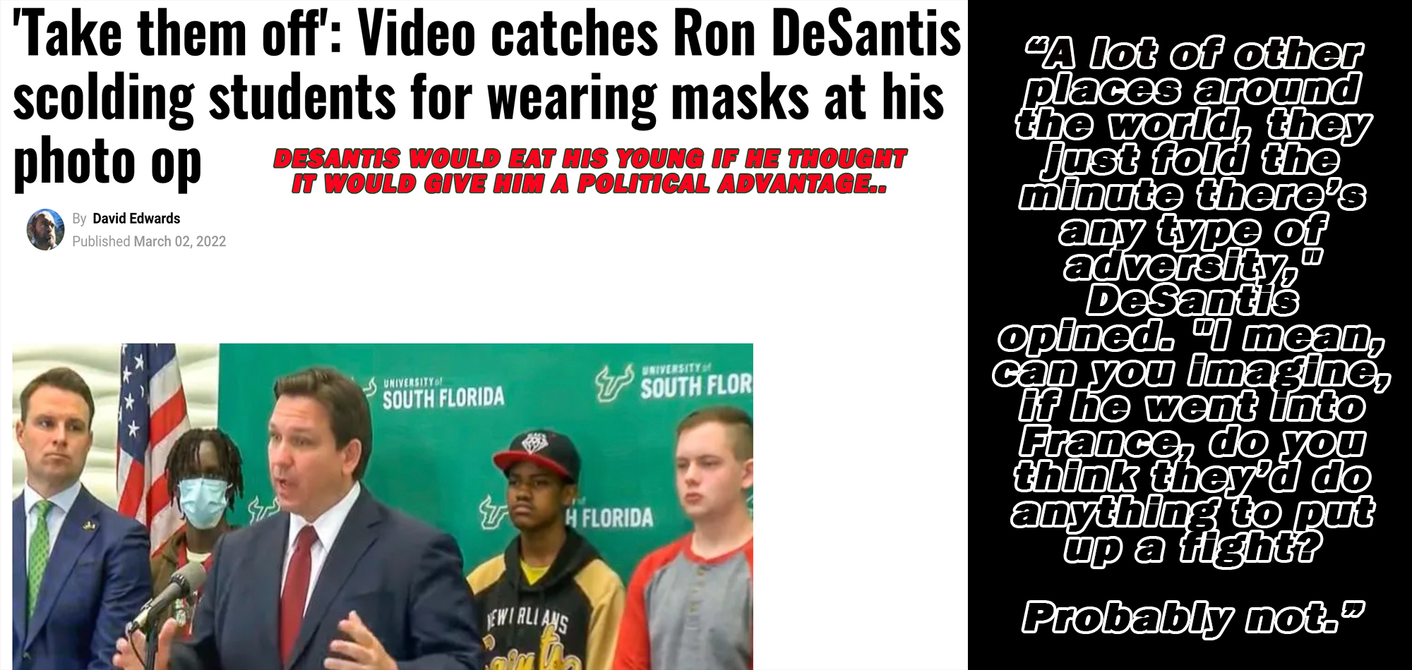 “A lot of other places around the world, they just fold the minute there’s any type of adversity,” DeSantis opined. “I mean, can you imagine, if he went into France, do you think they’d do anything to put up a fight? Probably not.”