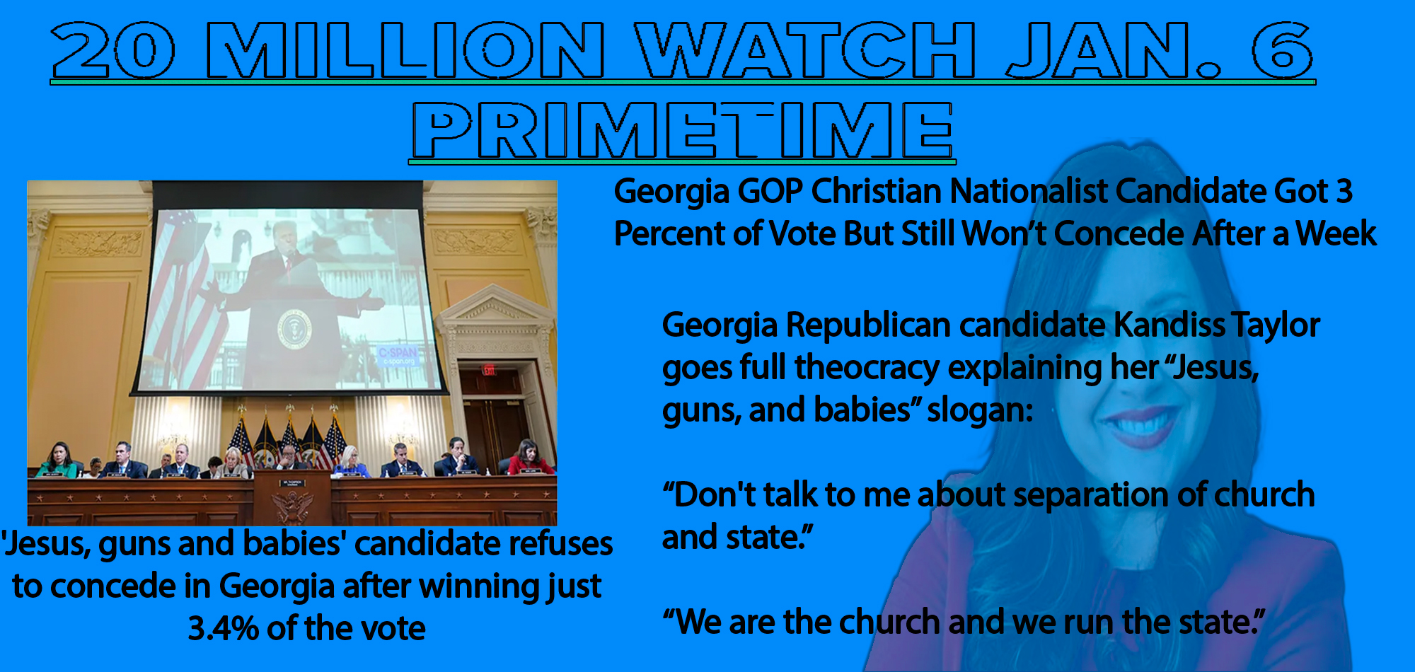 In Georgia’s 2022 GOP gubernatorial primary, one of the candidates was even more extreme than former Sen. David Perdue: Christian nationalist and far-right conspiracy theorist Kandiss Taylor, whose campaign theme was “Jesus, guns and babies.” Taylor campaigned on ridding Georgia’s government of Satanic influence, winning only 3.4 percent of the vote when the primary was held on May 24. But Taylor, in true MAGA fashion, is claiming that the election results are false — and in order to prove it, she is asking Georgia residents to sign notarized affidavits saying that they voted for her.