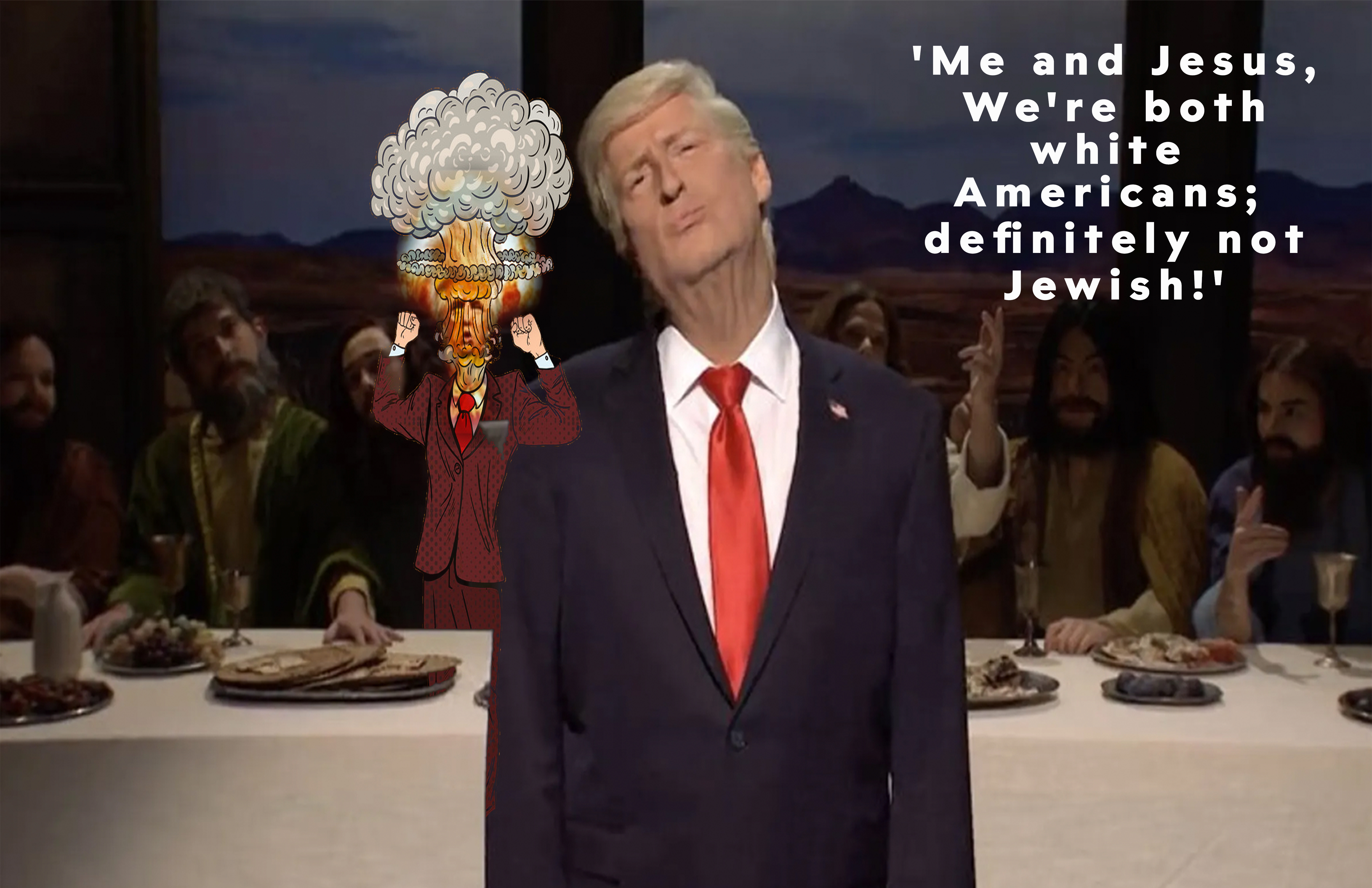 Standing in front of a re-enactment of the Last Supper, fake Trump added, “If you haven’t put it together folks, I’m comparing myself to Jesus. Again. And what better time than on his birthday, Easter? …We’re both very tall, very popular, and both, frankly, white Americans.”