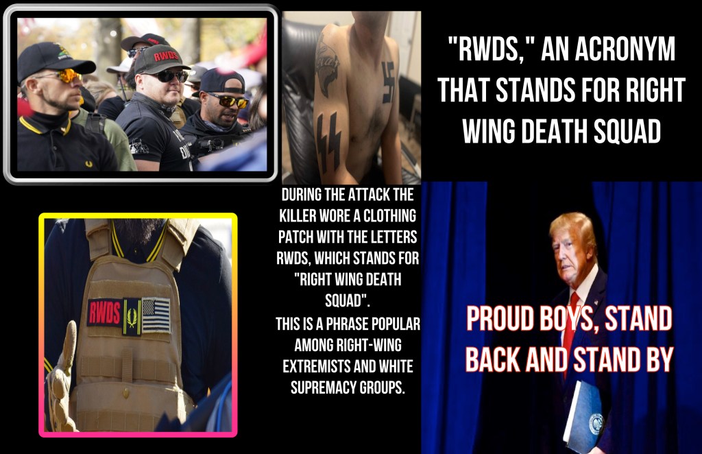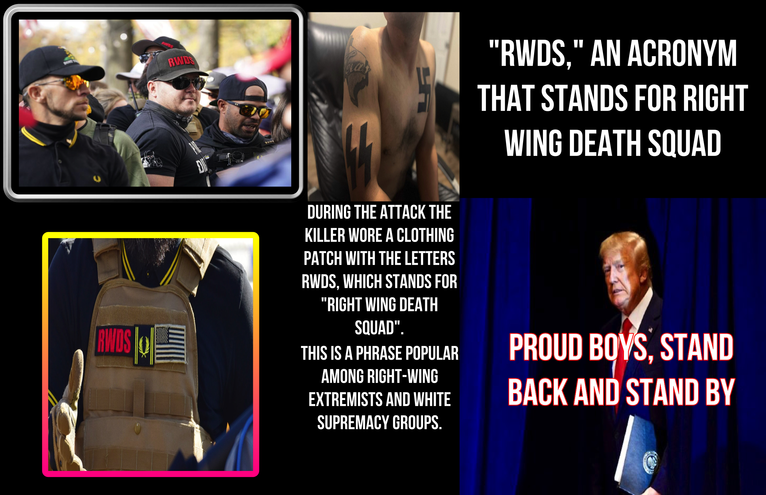 During the attack the killer wore a clothing patch with the letters RWDS, which stands for “Right Wing Death Squad”. This is a phrase popular among right-wing extremists and white supremacy groups.