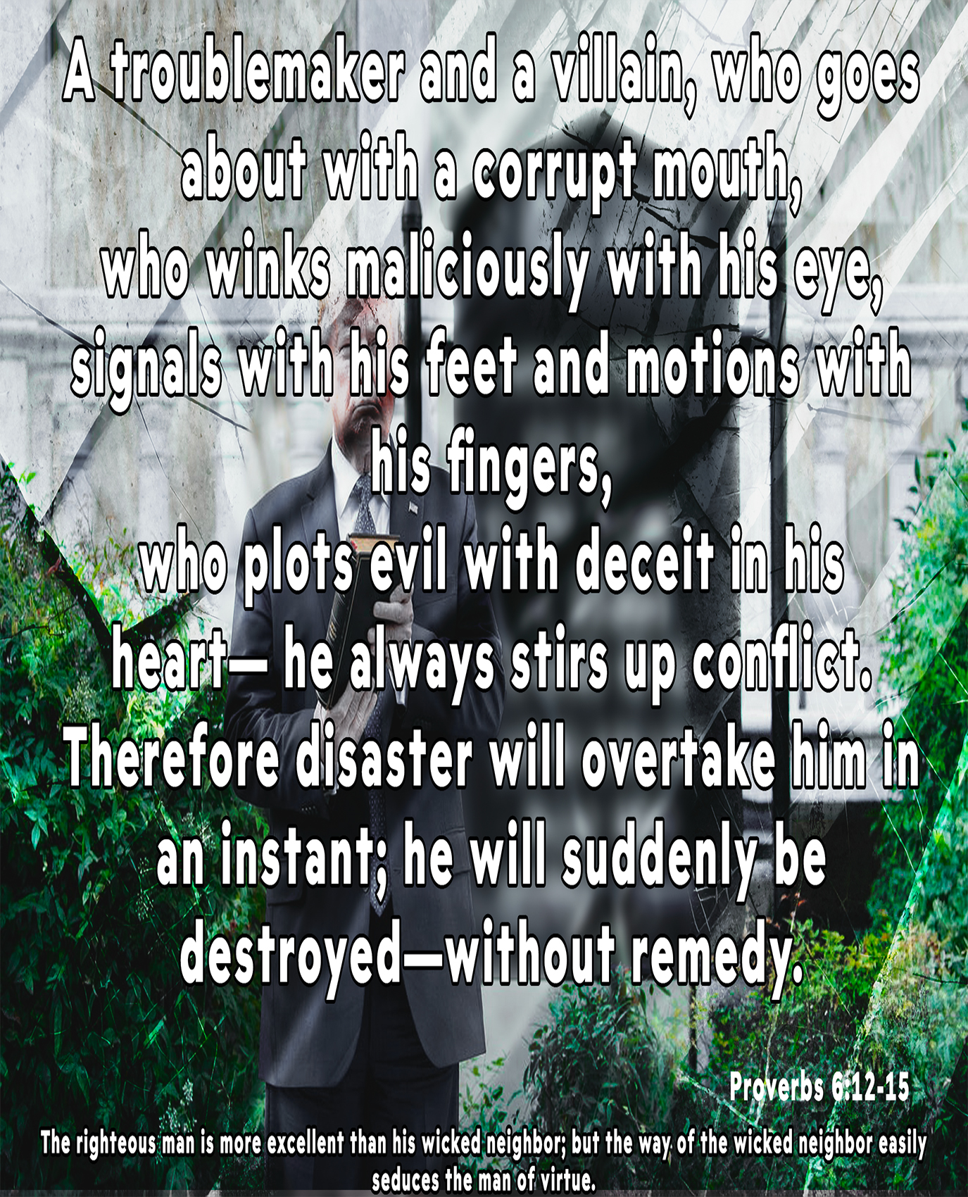 He devises evil continually, He sows discord. Therefore his calamity shall come suddenly; Suddenly he shall be broken without remedy.