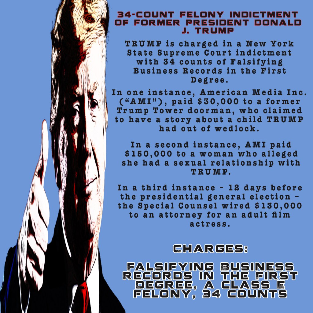 TRUMP is charged in a New York State Supreme Court indictment with 34 counts of Falsifying Business Records in the First Degree.